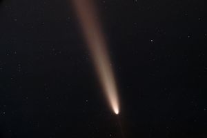 The comet was just visible to the naked eye, shining around mag +2 in the evening sky. The comet appeared as a fuzzy spot with a glow above it, but it revealed it's beautiful coma and tail through long exposures. Also showing, you can see the comet's anti-tail on the bottom. This is the path the comet came from, leaving behind all it's remains. Taken on Oct 14, 2024