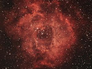 The Rosette Nebula is a vibrant emission nebula in the Hydrogen-Alpha spectrum, located in the constellation Monoceros. Although too dim to see in a telescope, this object is larger than the full moon in the sky. Imaged with a ZWO ASI533MC in a SkyWatcher 62ED Refractor