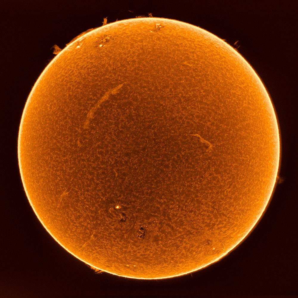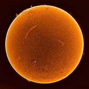 The Sun captured in the red spectrum line of Hydrogen Alpha. This is used to study the Sun's Chromosphere, and to observer many other features of the Sun. The inverted Sun shows prominences all along the edge, sunspots that are active regions, and filaments that streak across the surface. Taken on June 22, 2024
